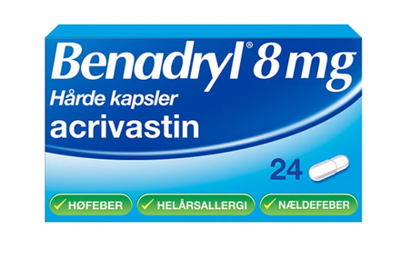 Produktbeskrivelse Benadryl anvendes ved allergiske sygdomme, især nældefeber, høfeber og helårssnue. Benadryl bør ikke gives til børn under 15 år uden lægens anvisning. I pakningerne med medicin findes en patientvejledning, som du altid bør læse grundigt, inden du tager medicinen. Hvis du er i tvivl, om du må bruge medicinen, bør du kontakte egen læge. Dosering · Den anbefalede dosis er: o Voksne og børn over 15 år: § 1 kapsel efter behov, højst 3 gange over en 24 timers periode. o Bør ikke anvendes til børn under 15 år uden lægens anvisning. o Anvendes med forsigtighed, hvis du har nedsat nyrefunktion. Advarsler og forsigtighedsreglerDe vigtigste advarsler og forholdsregler som du skal være opmærksom på er nævnt her. For yderligere information henvises til indlægssedlen som du finder i pakningen eller produktresumé nederst på denne side. · Tag ikke dette lægemiddel: o Hvis du er overfølsom (allergisk) over for det aktive stof, eller et af de øvrige indholdsstoffer (se indlægssedlen). · Tal med lægen: o Hvis dine nyrer ikke virker normalt, skal du altid tale med din læge, før du bruger Benadryl. o Hvis du skal have taget allergitest, må du stoppe med Benadryl 3 dage før, da resultatet kan blive påvirket. o Benadryl indeholder lactose. Bør ikke anvendes hvis din læge har fortalt dig, at du ikke tåler visse sukkerarter. o Indeholder mindre end 1 mmol (23 mg) natrium pr. kapsel dvs. det er i det væsentlige natriumfrit. · Brug af anden medicin: o Tal altid med lægen inden du tager Benadryl, hvis du tager lægemidler, der kan virke sløvende så som nervemedicin, beroligende medicin eller sovemedicin, da den sløvende effekt kan forværres. o Benadryl kan forstærke den sløvende virkning af alkohol. · Graviditet og amning: o Du bør kun tage Benadryl ifølge aftale med din læge. · Trafik- og arbejdssikkerhed: o Ingen mærkning. Benadryl kan forårsage svimmelhed, døsighed og søvnighed og kan for enkelte påvirke evnen til at føre motorkøretøj eller betjene maskiner i mindre, moderat eller væsentlig grad. · Overdosering: o Symptomer på overdosering: § Døsighed eventuel bevidstløshed. Kvalme og opkastning kan optræde. BivirkningerDette lægemiddel kan som al anden medicin give bivirkninger, men ikke alle får bivirkninger. For yderligere information om mulige bivirkninger henvises du til indlægssedlen i pakningen eller produktresumé nederst på denne side. · De mulige bivirkninger som du kan opleve er: o Meget almindelige bivirkninger (forekommer hos flere end 1 ud af 10 patienter): § Døsighed, i de fleste tilfælde af mildere karakter. o Almindelige bivirkninger (forekommer hos mellem 1 og 10 ud af 100 patienter): § Svimmelhed, kraftig hjertebanken, tørhed i munden, hududslæt. o Meget sjældne bivirkninger (forekommer hos færre end 1 ud af 10.000 patienter, inklusiv enkeltstående rapporter): § Pludseligt hududslæt, åndedrætsbesvær og besvimelse (inden for minutter til timer), pga. overfølsomhed (anafylaktisk reaktion). Kan være livsfarligt. Ring 112. o Bivirkninger, hvor hyppigheden ikke er kendt (hyppigheden kan ikke estimeres ud fra tilgængelig data): § Hovedpine, mavegener, kløe. Opbevaring og holdbarhed · Opbevares utilgængeligt for børn. · Må ikke opbevares over 30°C. · Brug ikke produktet efter den udløbsdato, der står på pakningen. · Spørg på apoteket, hvordan du skal bortskaffe medicinrester. Af hensyn til miljøet må du ikke smide medicinrester i afløbet, toilettet eller skraldespanden.